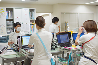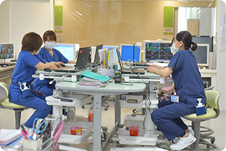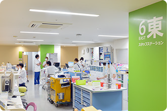 6東病棟は循環器内科とリウマチ膠原病内科を中心とした患者さんが入院される病棟です。内科疾患の急性増悪、心臓に疾患を抱えた患者さんが多く入院されています。急変対応や重症患者さんの対応も多いため、救急研修など院内外の勉強会や研修会に力を入れ、積極的に取り組んでいます。高齢の患者さんに早期に回復していただけるよう合併症予防や日常生活支援を行うと共に不安に寄り添える看護を提供しています。