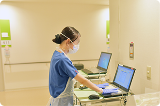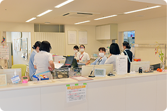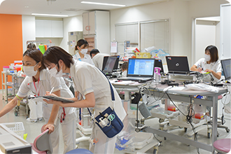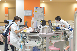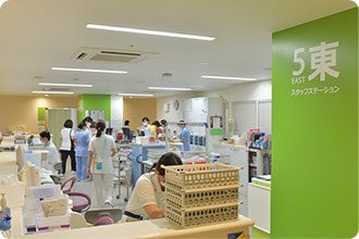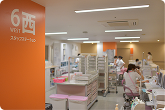 4東病棟は、産婦人科、小児科、慢性器疾患の患者さんの混合病棟です。産後のお母さんや赤ちゃんに対して産後ケア、母乳外来も行っています。育児や乳房、母乳栄養に関してのトラブルや相談に対応しています。
