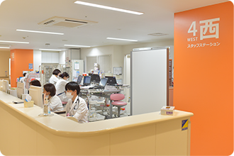 4西病棟は、一般病棟・自宅・他の医療施設からの患者さんを受け入れている地域包括ケア病棟です。医師・退院支援部門・リハビリ部門・薬剤脚・栄養士・看護補助者など多職種と協働し、患者さんとご家族が望まれる場への復帰支援を行っています。退院支援を通して患者さんやご家族の生活を見据え、個別性に合わせた看護を行い、住み慣れた地域での生活を継続していただけるよう、在宅医や訪問看護師、ケアマネージャーなど地域の医療スタッフと退院前カンファレンスなどを行い継続看護にも力を入れています。