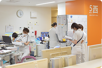 5西病棟は外科、泌尿器科、透析外科・耳鼻科などの周術期患者さんが入院される急性期病棟です。外科は消化管や肝胆管系を含めた消化器全般の疾患、泌尿器科は尿路系悪性疾患や尿路結石・前立腺肥大などの患者さんが入院されます。手術後の疼痛緩和及び合併症予防に対する看護と同時に患者さんやそのご家族に寄り添い、安心して治療を受けていただけるようサポートしています。また急性期看護はもちろんのこと、ストーマケアや早期にリハビリに取り組めるようチームで取り組んでいます。心溢れる笑顔とチームワークで信頼される医療と看護の提供をめざし頑張っています。